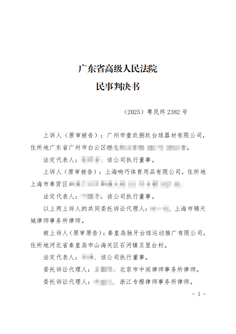 近日,广东省高级人民法院对“DZS”“创世铠甲”品牌方上海响巧体育用品有限公司及其经销商广州市壹玖捌玖台球器材有限公司的上诉作出终审判决!
