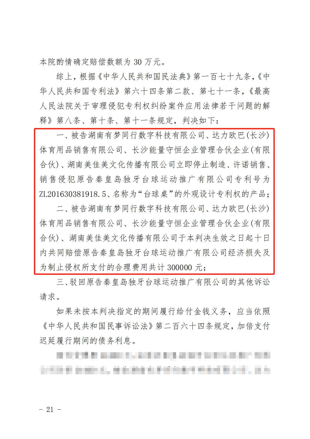 近日,湖南省长沙市中级人民法院作出一审判决,明确认定:“达力欧巴”品牌相关公司——湖南有梦同行数字科技有限公司、达力欧巴(长沙)体育用品销售有限公司、长沙能量守恒企业管理合伙企业(有限合伙)、湖南美佳美文化传播有限公司等四被告,立即停止制造、销售、许诺销售侵犯“独牙台球桌”外观设计专利权的产品;四被告共同赔偿独牙公司经济损失及合理维权费用共计30万元!