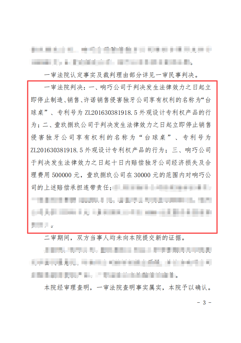 两家公司因侵犯“独牙”台球桌外观设计专利权,被判处立即停止侵权并赔偿50万元。