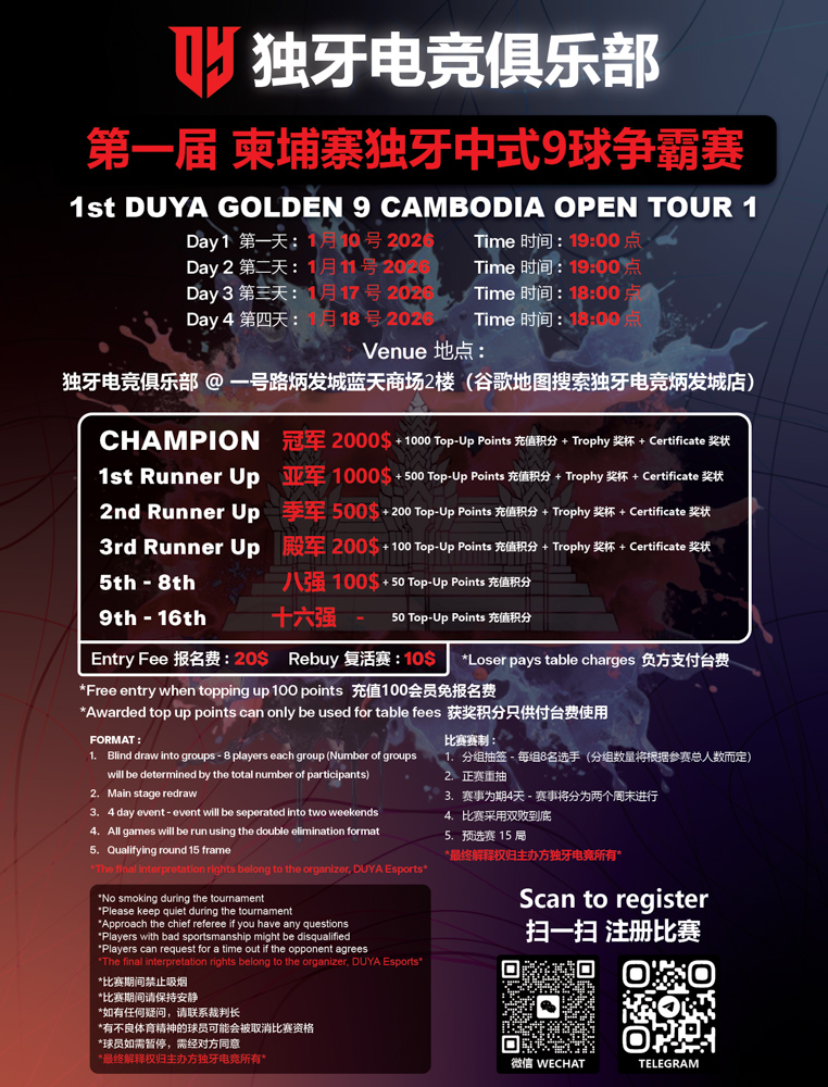 主办人苏总,已在金边扎根八年。他凭借“电竞+台球”的破圈联动,成功运营4家门店,今年5月还将有4家新店陆续亮相。很多人好奇:在美式、斯诺克为主流台球运动的柬埔寨,中式九球是怎么杀出重围的?答案,就在苏总的「独牙电竞俱乐部」。